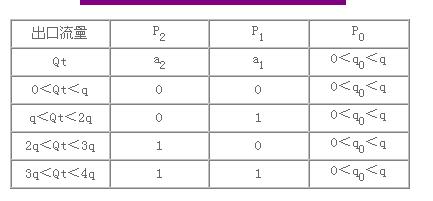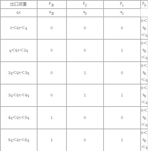 下面描述圖2給水系統(tǒng)的工作原理。對采用開關控制的水泵P1與P2,用數(shù)字1表示水泵工作,以數(shù)字0表示水泵停止工作,于是P1與 P2的組合工作狀態(tài)用一個兩位的二進制數(shù)a2a1表示(如表2)。P0采用變頻器連續(xù)調(diào)節(jié)電機轉(zhuǎn)速,把它與P1P2的組合工作相結(jié) 合,則整個給水系統(tǒng)的流量可以在0≤Qt≤4q的區(qū)間連續(xù)變化(計Qt時近似忽略了由于水泵并聯(lián)所造成的流量損失)。表2與表1的不同之處在于:由于變頻調(diào)速水泵P0的加入,可以在0≤Qt≤4q的全流量范圍內(nèi)連續(xù)調(diào)節(jié)給水流量,故理論上可以實現(xiàn)高精度的恒壓控制,而不是表1所描述的在一定范圍內(nèi)的穩(wěn)壓控制。同時,與傳統(tǒng)的恒壓變頻調(diào)速給水系統(tǒng)相比較,變頻器的設計選用容量可減小一半。因此,本方案兼具了二進制變流量水泵組合方案和典型變頻調(diào)速恒壓給水方案的優(yōu)點。