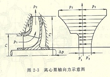 液體以低壓進入葉輪,而在高壓下流出葉輪,也就是說,葉輪人口處液體的壓力較低,葉輪背側的壓力較高,而且由于葉輪前后蓋板形狀的不對稱,使得葉輪兩側受到的液體壓力不相等,因而產生了軸向推力,如圖2-3所示。這個軸向推力作用在葉輪上,通過葉輪螺母傳遞到整個轉子上,使泵的整個轉子發(fā)生向葉輪吸人口方向的竄動,引起泵的振動,軸承發(fā)熱,甚至損壞零件。為避免軸向推力的不良影響,圖2 2所示
