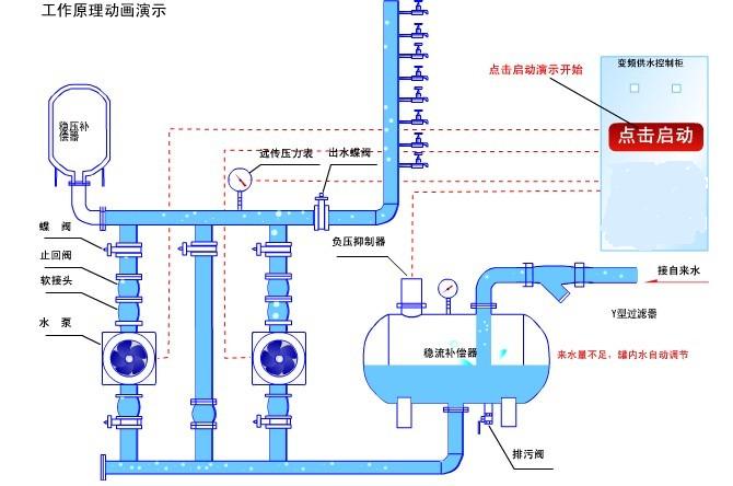 2.變頻泵的進(jìn)水口與不銹鋼穩(wěn)流補(bǔ)償器相連,微機(jī)系統(tǒng)檢查穩(wěn)流補(bǔ)償器內(nèi)的壓力,當(dāng)壓力降到零壓時(shí),安裝在穩(wěn)流補(bǔ)償器內(nèi)上方外部的真空自動(dòng)抑制器就會(huì)自動(dòng)打開(kāi)穩(wěn)流補(bǔ)償器內(nèi)外空氣通道開(kāi)通,通過(guò)進(jìn)水壓力檢測(cè)和真空自動(dòng)抑制器來(lái)保證穩(wěn)流補(bǔ)償器內(nèi)不產(chǎn)生負(fù)壓,從而保證自來(lái)水管網(wǎng)的正常供水。
