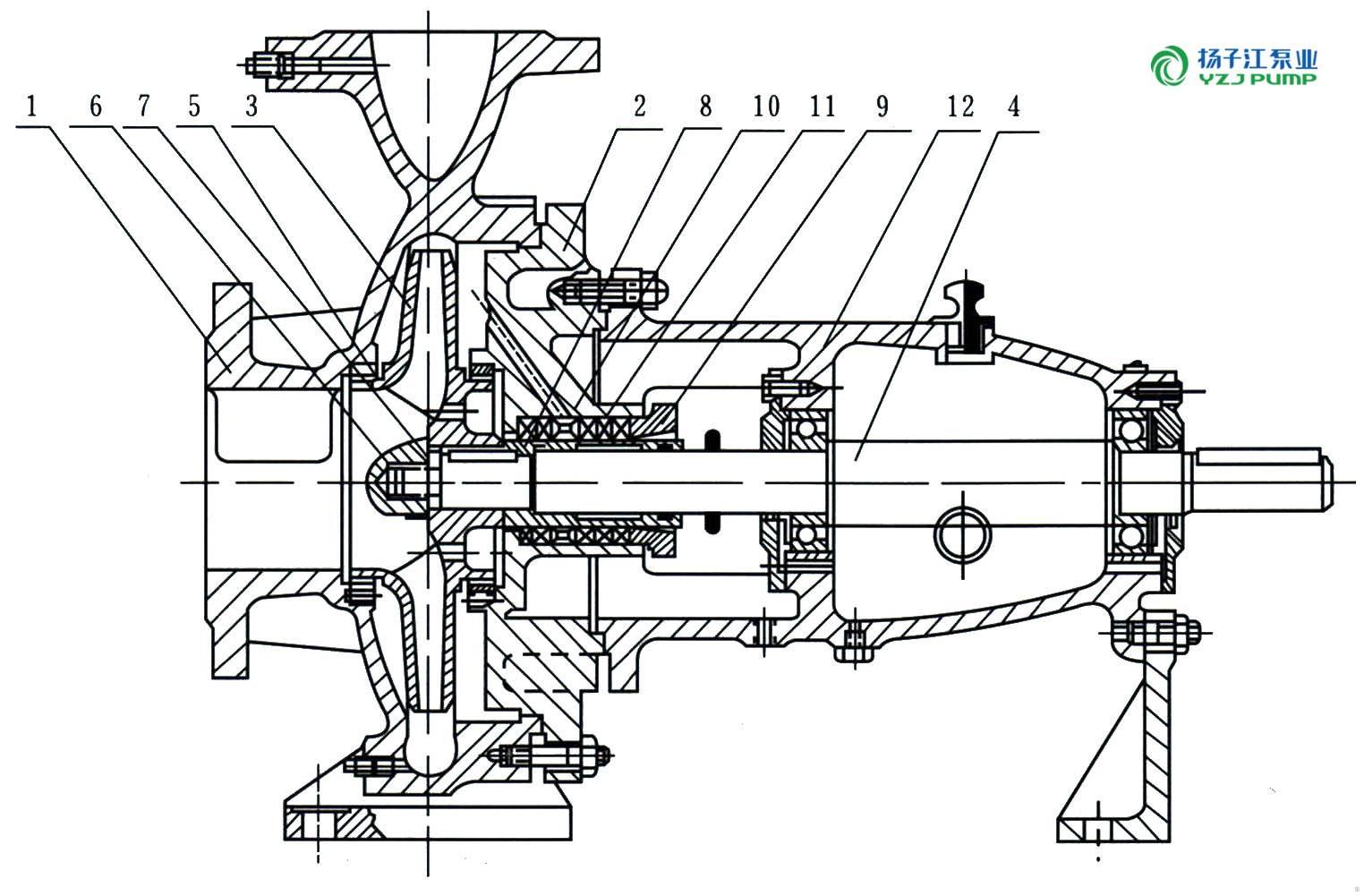 IS、IR型泵系根據(jù)國家標(biāo)準(zhǔn)ISO2858所規(guī)定的性能和尺寸設(shè)計的,主要由泵體(1)、泵蓋(2)、葉輪(3)、軸(4)、密封環(huán)(5)、軸套及懸架軸承部件(12)等所組成。