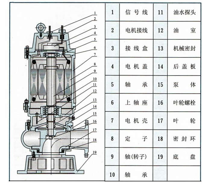 QW型無(wú)堵塞潛水排污泵由電機(jī)與泵兩部分組成,二者通過(guò)油隔離室及機(jī)械密封組件隔開(kāi),屬機(jī)電一體化產(chǎn)品,電機(jī)與泵合用同一軸(轉(zhuǎn)子)整個(gè)水泵長(zhǎng)度短,結(jié)構(gòu)緊湊。配備多種保護(hù)裝置,使得泵運(yùn)行可靠,其主部件作用如下: